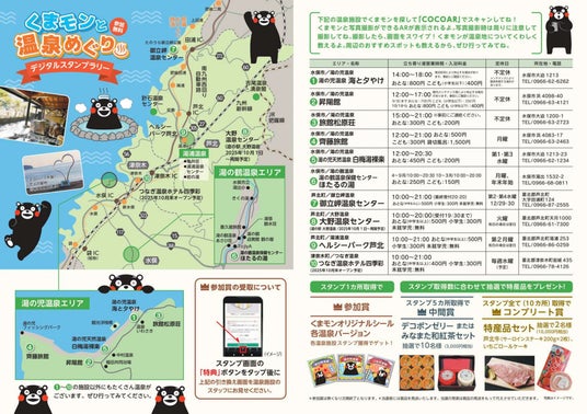 熊本県(知事:木村 敬)では、県南部の、水俣・芦北・津奈木地域を舞台に、くまモンと一緒に温泉をめぐる「くまモンと温泉めぐり デジタルスタンプラリー」を令和7年9月27日(土)~令和8年1月31日(土)の期間、開催します。今年は、水俣市の「湯の児温泉」が開湯100周年を迎え、さらに、津奈木町の「つなぎ温泉四季彩」が10月末にリニューアルオープンするなど、地域全体が温泉の魅力を発信する絶好の機会となっています。