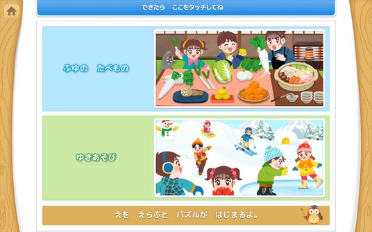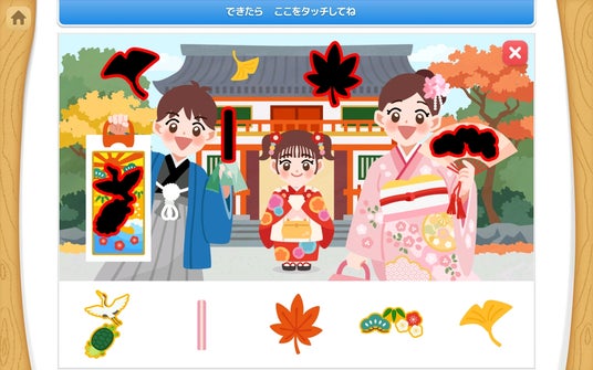 七五三、雪遊び…パズルを楽しみながら季節の行事や言葉を学ぶ。背景にも隠された音声の仕掛けが子どもの好奇心を刺激。