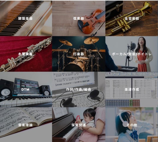 ピアノ、バイオリン、ギター、サックス、DTM、作曲、ボイトレ、ボカロ、管楽器、打楽器など40種類以上。