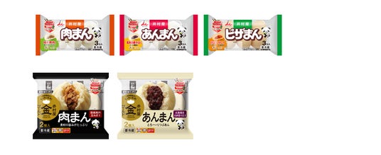1964年に発売した井村屋のロングセラーブランド「肉まん・あんまん」は、2024年に発売60年目を迎えました。スチーマーでのホットスナックとしての販売、電子レンジ対応商品の開発などを経て、軽食として時代を超えてご好評いただいており、発売以来累計600種類以上のシリーズ商品を販売しています。冷凍タイプ「4コ入パックまんシリーズ」「ゴールドまんシリーズ」、チルドタイプ「3コ入チルドパックまんシリーズ」「ゴールドまんシリーズ」は、こだわりの生地や具材のおいしさのほか、買い置きのしやすさや、電子レンジで約30秒~1分半ほど(※1)あたためるだけでお召し上がりいただける利便性が特長です。