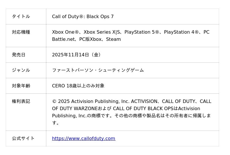 Call of Dutyに関する情報は、www.callofduty.com、www.youtube.com/@CallofDutyJPにてご確認いただけます。また最新の情報については、公式X(@CallofDutyJP)をフォローしてください。