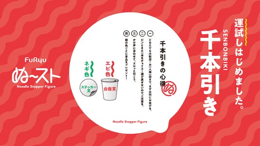 11月15日(土)のユーザーデーには、縁日でおなじみのくじ引き「千本引き」を開催。ラーメンの麺に見立てた紐の中からお好きな1本を引くと、紐の色に応じて『ぬースト』の限定台座もしくは、ぬースト商品がデザインされたオリジナルステッカーを必ずゲットできます。