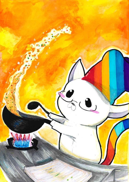 また、ひゅーにゃんのベレー帽をコック帽に変更したのもとてもいいアイデアだと思いました。シェフになって美味しい料理を作るひゅーにゃんの未来がわかりやすく丁寧に描かれている作品です」
