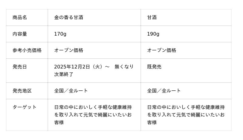 酒粕と米麹の独自ブレンドで、『森永甘酒』は、多くのお客様に愛されてきました。「金の香る甘酒」は、純米大吟醸の酒粕と山形県産米麹と2つの発酵素材、さとうきびの風味をいかした素焚糖(すだきとう)を組み合わせ、広口のキャップ付きボトル缶で香り立ちと“つぶ感”を余すことなく楽しめる、冬だけの特別な一杯です。年末年始のくつろぎ時間や寒い日のリラックスタイム、自分へのご褒美にもぴったりな新商品の発売により、心も体もあたたまる至福のひとときをお客様に笑顔をお届けしてまいります。