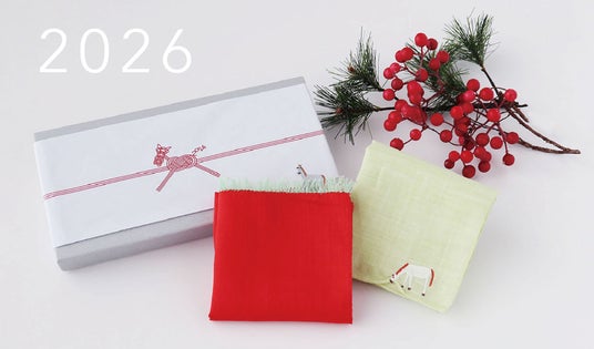2026年の干支「午」をモチーフにデザインした、年末年始の贈りものにふさわしい特別な一枚です。日本の文化として根づく「干支」に願いを託した、縁起の良いハンカチーフが今年も登場します。