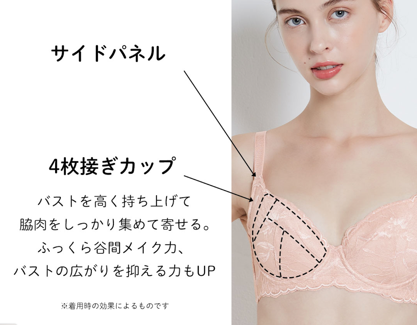 その中でも、軽いつけ心地でありながら、脇や背中のお肉をしっかり集めてきれいなバストラインを作り、理想のシルエットに近づく「贅沢脇肉キャッチャー(R)︎」。その特徴は以下の4点となります。