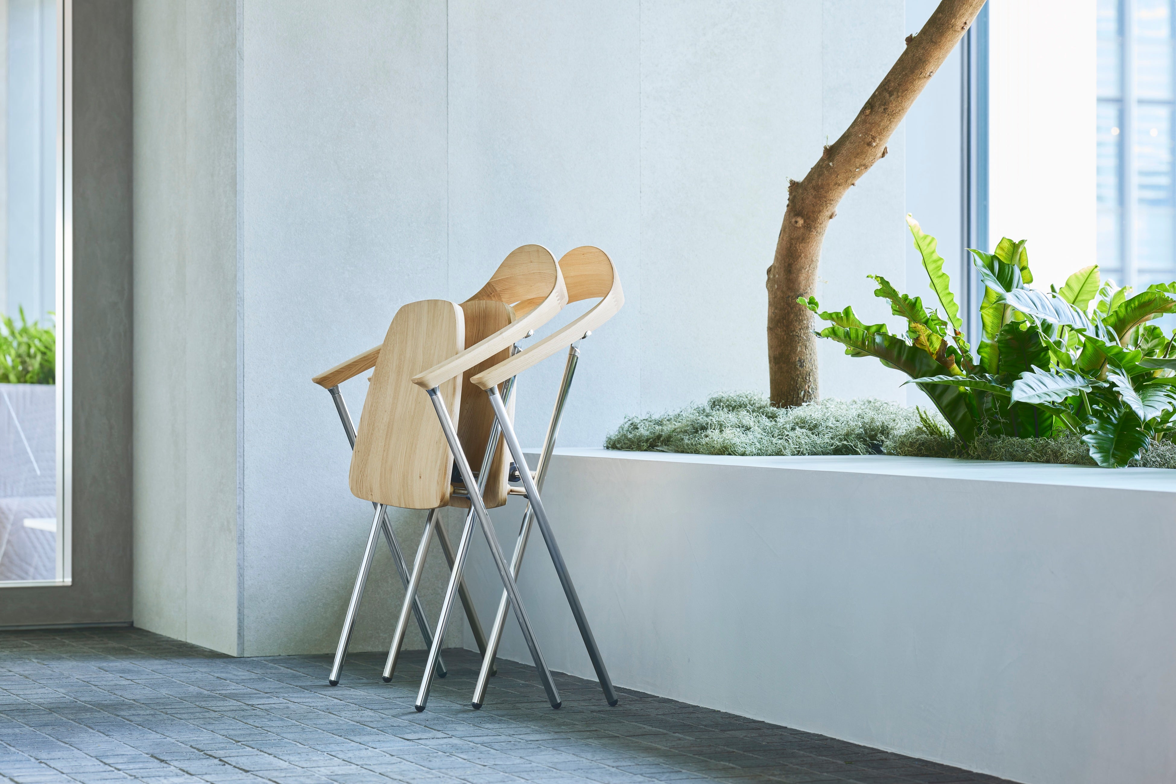 ダイニングチェアのシルエットを持ちながら、折りたためて自立しネスティング収納もできるワークシーン向けの木製チェア。背座には国産広葉樹であるクリの無垢材を採用。密度が小さく軽いクリ材は機動性が求められる家具との相性が良く、持ち運びやすい製品重量5.2kgを実現しています。カリモク家具の持つノウハウによってクリの明るい表情を活かした美しい仕上げが施され、普遍的なフォルムにさらなる豊かさが加わりました。