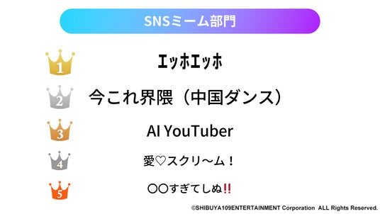 日々目まぐるしく流行りが入れ替わるミームですが、2025年はAI音声やAI動画生成を活用したショート動画ミームが数多くノミネートされました。また、「今これ界隈」や「○○すぎてしぬ!!」など、明るく自虐を共有する文脈のミームは、 2025年のトレンド項目に多く共通するムードの特徴です。