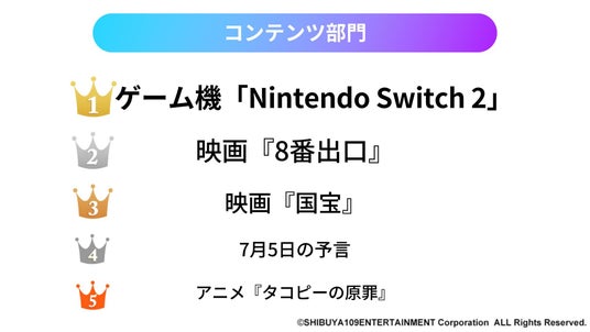 ノミネートには、アニメやゲーム、時事ネタなど幅広いジャンルのコンテンツがあげられました。今年はホラー・SF系の作品が人気となり、「7月5日の予言」についても大きな話題に。自身の関心を起点にコンテンツを楽しむ傾向が強く現れました。