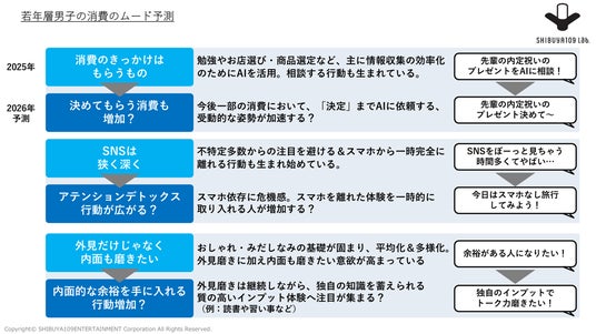 また、今回のトレンド大賞の結果および、若年層男性5名を対象に実施したインタビューの結果を踏まえ、2026年の若年層男性の消費ムード予測をまとめました。