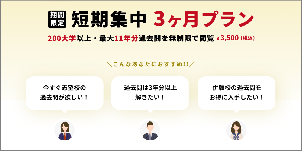 このたび、過去問対策の本格シーズンに向けて、「入試正解デジタルプレミアム」にて期間限定で「短期集中3ヶ月プラン」3,500円(税込)の販売を開始します。(2026年3月25日までの期間限定販売)