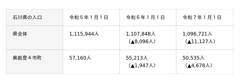 ○ 石川県では、令和6年能登半島地震(令和6年1月1日)および令和6年奥能登豪雨(令和6年9月21日)の発生により、奥能登地域を中心に人口減少が加速しております。