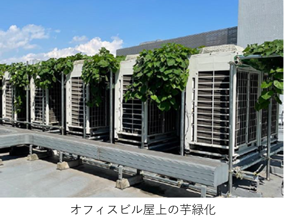 *1 株式会社日建設計と住友商事株式会社が共同で開発した技術で、空調室外機の周りに芋の葉を繁茂させ、葉による日陰効果と蒸散作用により機器周辺の温度を下げることで空調電力の低減効果を得る仕組み(2016年特許取得済)。