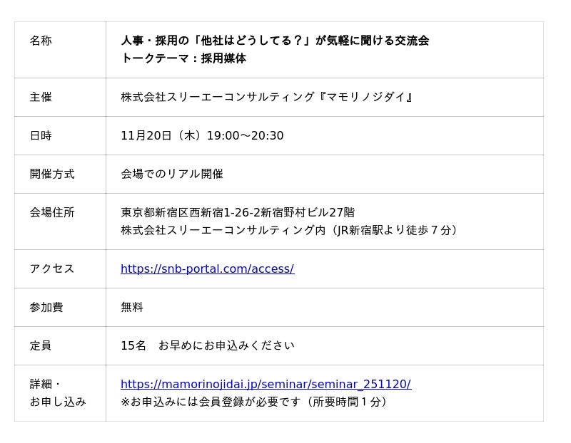 中小企業の守備力を強くするメディア『マモリノジダイ』を運営する株式会社スリーエーコンサルティング(代表取締役社長:竹嶋 寛人)は、2025年11月20日(水)19:00より、無料イベント「人事・採用の『他社はどうしてる?』が気軽に聞ける交流会」を開催します。今回のテーマは、『採用媒体』です。