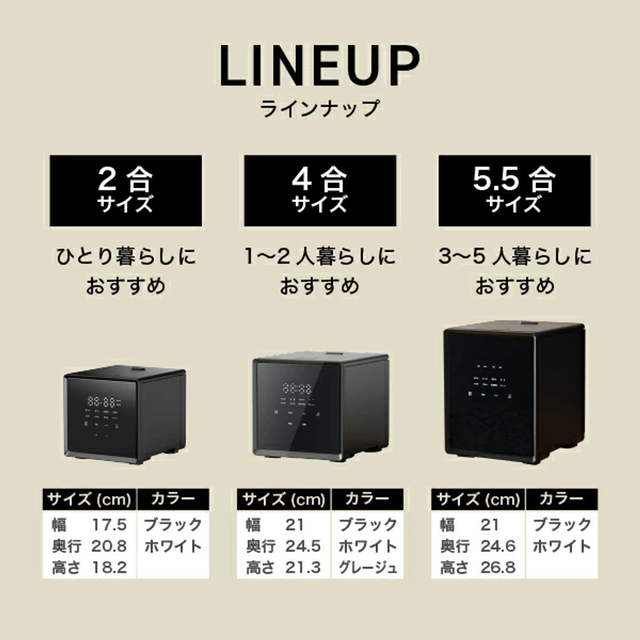 2合炊き・4合炊き・5.5合炊きタイプの3種類があり、一人暮らしからファミリーまで好みに合わせて使えます。