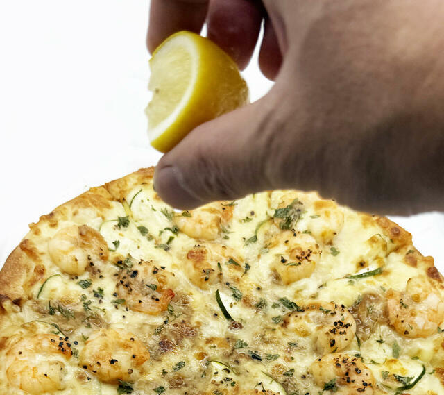 マヨネーズベースの上に、特製ガーリックソース、大海老、スライスズッキーニ、オニオン、ブラックペッパー、パセリなどが乗ったピザで、シンプルながらもパンチある一品となています。