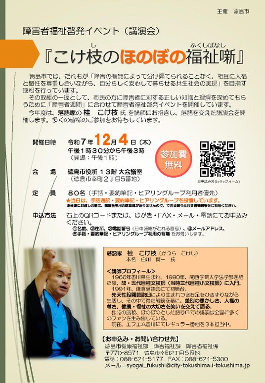 徳島市HP掲載の電子申請または、「講演会参加希望」と明記のうえ、はがき・FAX・メール( syogai_fukushi@city-tokushima.i-tokushima.jp)・電話にてお申込みください。