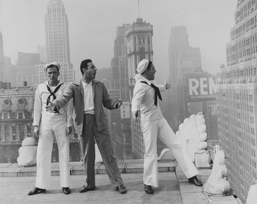 3.『踊る大紐育』(1949年、スタンリー・ドーネン監督)撮影中のフランク・シナトラ(左)、スタンリー・ドーネン(中央)、ジーン・ケリー(右) 映画芸術科学アカデミー マーガレット・ヘリック図書館所蔵 / Image courtesy of Margaret Herrick Library, Academy of Motion Picture Arts and Sciences