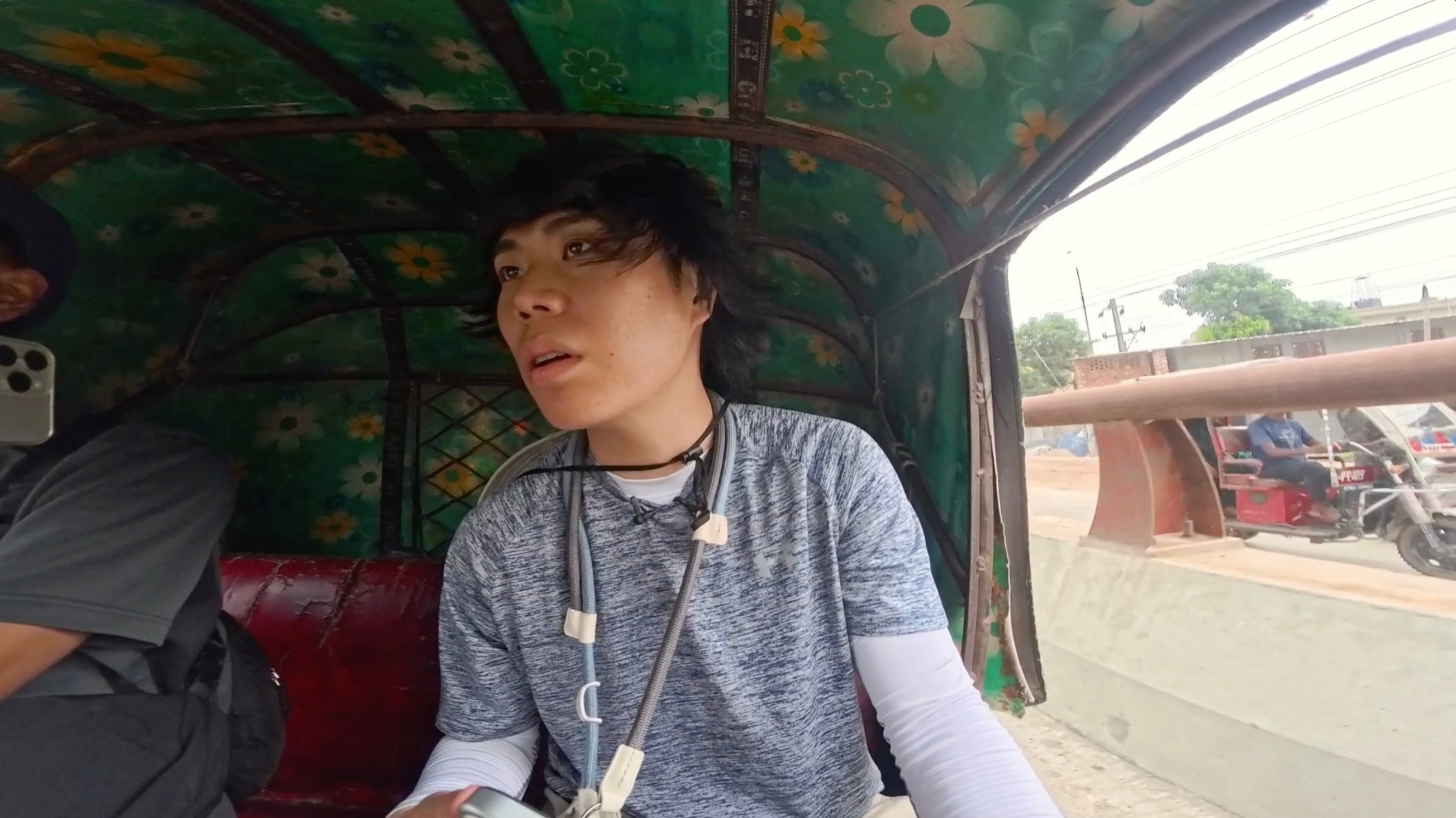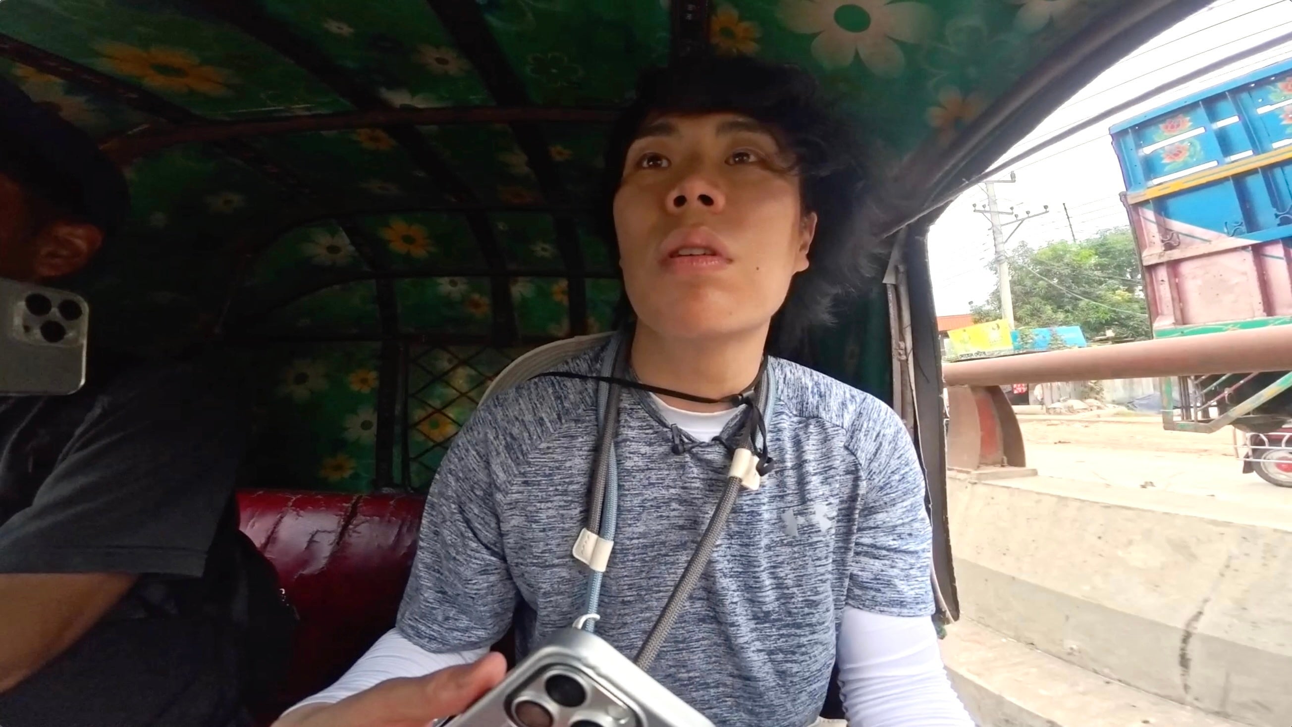 その後、ホテル取締役が勧めたマハスタンガル遺跡を探訪したくるまは、バングラデシュ北西部の都市・ランプルへ向かうためバス停まで三輪タクシー(CNG)で移動します。三輪タクシーに乗り込み、「やっぱCNGって速いな」「最強CNG」と、上機嫌で三輪タクシーへの信頼を語っていたくるまでしたが、走行中に突如「バシュ!」という破裂音が鳴り響き、車両が止まってしまう緊急事態が発生。突然の出来事にくるまは顔面蒼白となったものの、破裂音の正体がタイヤのパンクだったことが判明し、「めっちゃビックリした」「発砲されたかと思った」と安堵しました。