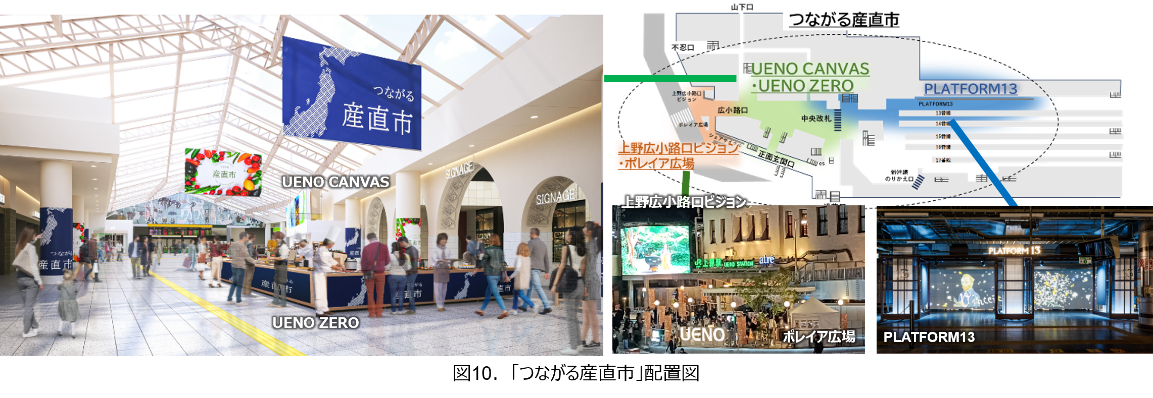 2026年春、グランドコンコースは、当社最大級のゼロカーボンメディア「UENO CANVAS」(約75平方メートル )とショールーミング空間「UENO ZERO」(約225平方メートル )を常設完備し、歴史ある大屋根空間を活かした、アートやサイネージ、光、音が調和する、新しい鑑賞体験空間へと変わります。これに加えて、「上野広小路口ビジョン」「ポレイア広場」「PLATFORM13」「CREATIVE HUB UENO “es”」や「パンダ橋」新幹線地下3階コンコース「ときめき広場」など、駅空間全体が、リアルな『文化創造HUB』となり、「文化」を通じて、「ひと」と「まち」・「地域」をつなげる舞台として完成します。上野駅は、駅空間全体で、東京の文化価値や地域の豊かな文化価値を国内外に発信し、新たな事業価値の創造を図ります。