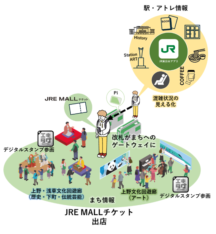 また、台東区や地域の文化施設等と連携し、文化回遊廊を巡り、施設等のデジタルスタンプを収集できるサービス(エキタグ)等、まちとデジタルで“つなげる(HUB)”サービスを拡充し、まちへの回遊促進に貢献します。