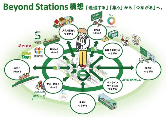 ヒトの生活における「豊かさ」を起点として、リアルの交流拠点である駅の強みを活かしながら駅空間の配置と機能を変革するとともに、JRE POINT生活圏の拡充を通じ、駅を「交通の拠点」から「暮らしのプラットフォーム」へと転換します。