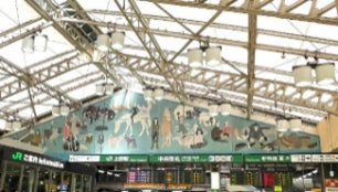 中央改札上部に設置。戦後復興期に「人間の自由」をテーマに優しい色使いで描かれている。現在、1985年、2002年につづく3回目の修復を修復研究所21が実施。浮き上がり接着、洗浄、欠損部の充填整形の作業中。今後、補彩・ワニス塗布を予定。
