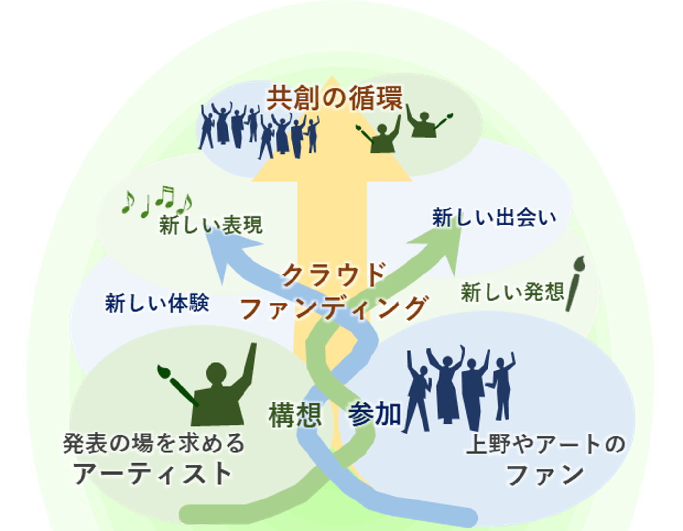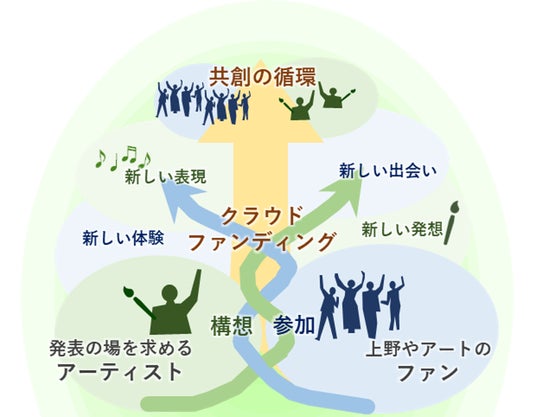 さらに、JR東日本グループは、上野駅の『文化創造HUB』の機能・価値向上に向け、アートファン等の参加を募る共創、かつ、持続可能な文化創造エコシステムの構築に挑戦します。発表の場を求めるアーティストと応援・支援者をクラウドファンディングによるマッチングを通じて、「ひと」とアートをつなぐ共創の循環を繰り返し、上野駅の文化価値のサスティナブルな高まりをまちに循環させます。