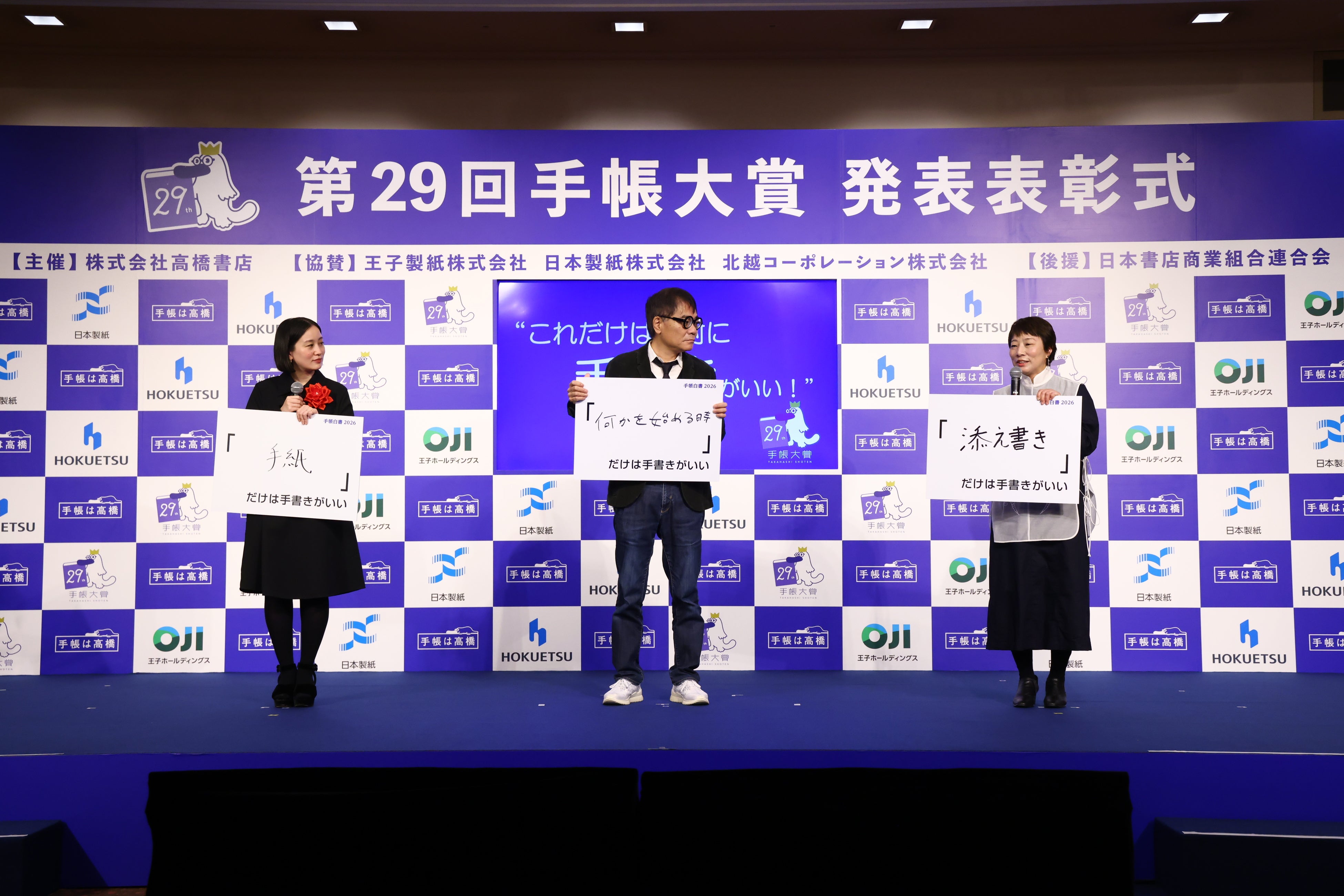 続いて、言葉を大切にする審査員の皆さんだからこそ語れる“手書き”へのこだわりについて、それぞれフリップに記入しお披露目されました。