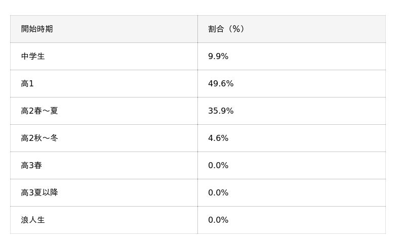 その結果、約5割(49.6%)が「高1から始めるのが理想」と回答した一方で、実際には約3割(31.1%)が“高2春~夏”から開始していることが明らかになりました。