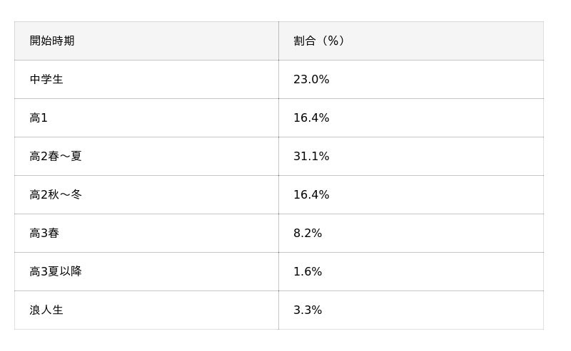 理想と考える時期よりも1年近く遅れてスタートしている実態が浮き彫りとなり、多くの受験生が「もっと早く始めるべきだった」と感じながら、厳しい受験勉強に臨んでいたと推察されます。