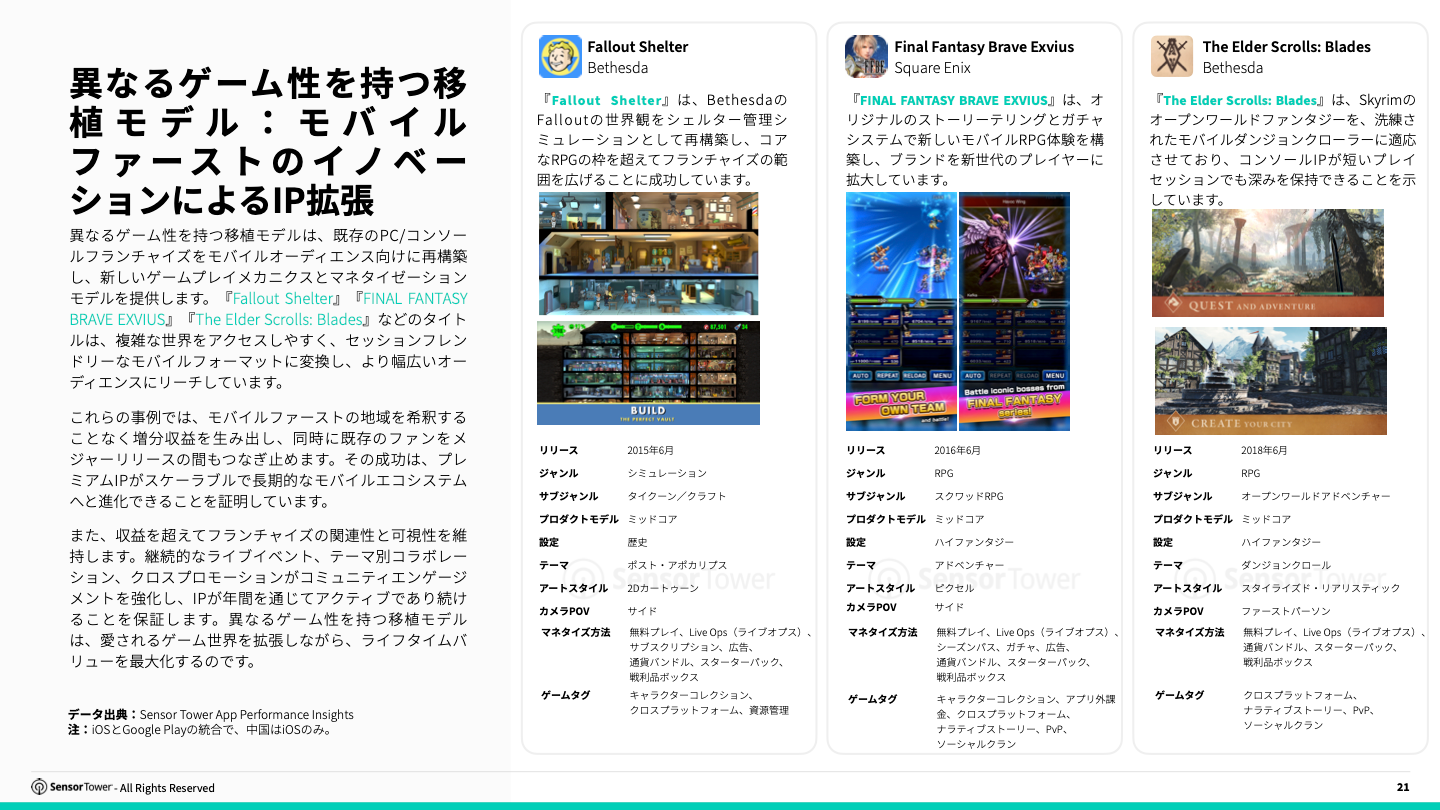 異なるゲーム性を持つ移植モデルは、既存のPC/コンソールフランチャイズをモバイルオーディエンス向けに再構築し、新しいゲームプレイメカニクスとマネタイゼーションモデルを提供します。『Fallout Shelter』『FINAL FANTASY BRAVE EXVIUS』『The Elder Scrolls: Blades』などのタイトルは、複雑な世界をアクセスしやすく、セッションフレンドリーなモバイルフォーマットに変換し、より幅広いオーディエンスにリーチしています。