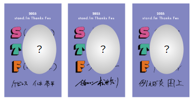 会場に来場のお客様に、「stand.fm Thanks Fes」の略称である「STF」を頭文字とする、オリジナルメッセージカードをランダムで1枚配布します。カードの表面には、本フェスイベントのキービジュアルがデザインされ、裏面には各パーソナリティの手書きコメントが印刷されています。【対象パーソナリティ】