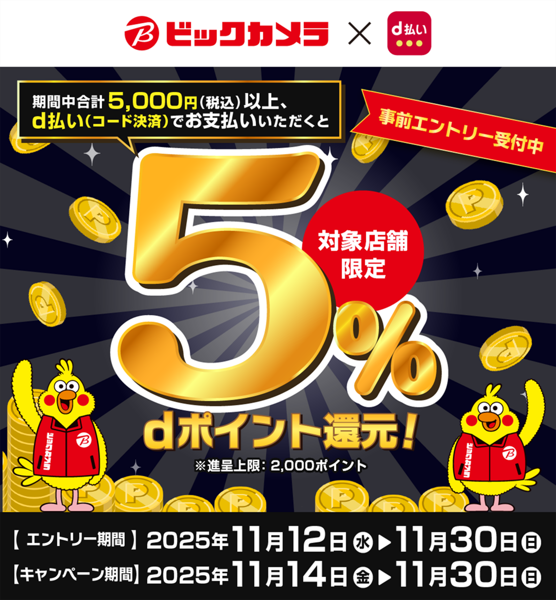 本キャンペーンの参加にはエントリーが必要で、2025年11月12日(水)から受付開始いたします。キャンペーン期間中、ビックカメラの対象店舗にて「d払い(R)」で期間中合計5,000円(税込)以上お支払いいただくと、お支払い金額の5%分のdポイントを進呈※1※2いたします。