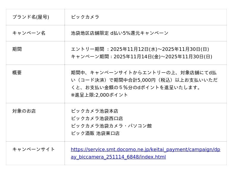 株式会社NTTドコモ(以下、ドコモ)は、ビックカメラにおいて、「池袋店舗限定 d払い5%還元キャンペーン(以下、本キャンペーン)」を2025年11月14日(金)から2025年11月30日(日)までの期間で開催いたします。