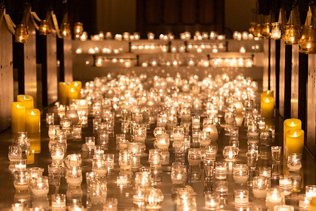 キャンドルナイトでは、照明を落とした礼拝堂に無数のキャンドルが灯り、幻想的で厳かな空間が広がります。柔らかな光に包まれながら、穏やかで特別な時間をお過ごしいただけます。