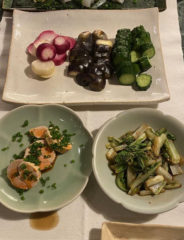 アオリイカの刺身、あん肝、ぬか漬け(ナス、キュウリ、ラディッシュ)、山東菜の油炒め(子供の頃、祖母の作るこれ、好きだった。祖母の方が美味しい)。