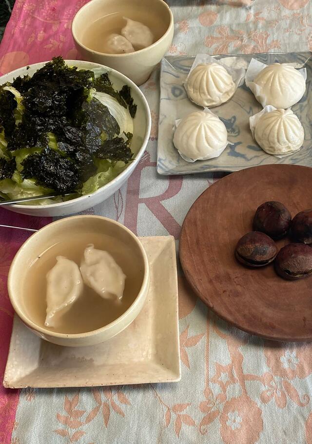 昨日ははしゃぎすぎた。寝坊。「飛雁閣」の点心(水餃子をスープに、豚まん)、チョレギ風レタス(韓国海苔)、昨日もらった杉並区育ちの栗(焼き栗)。
