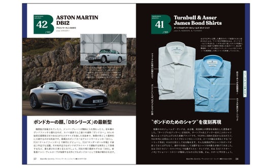 右) “ボンドのためのシャツ〞を復刻再現「ターンブル&アッサー ジェームズ・ボンド シャツ」 左) ボンドカーの顔、DBシリーズの最新型「アストンマーティン DB12」