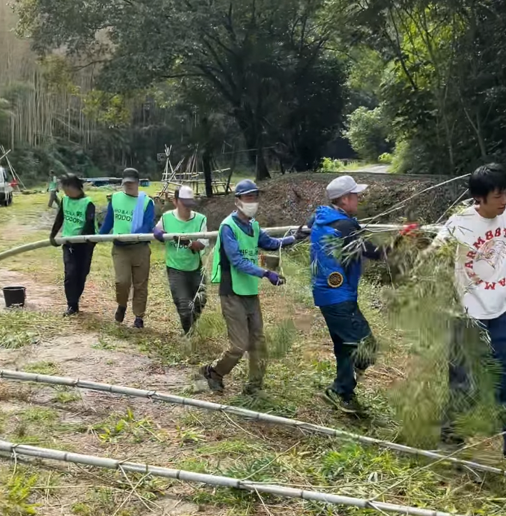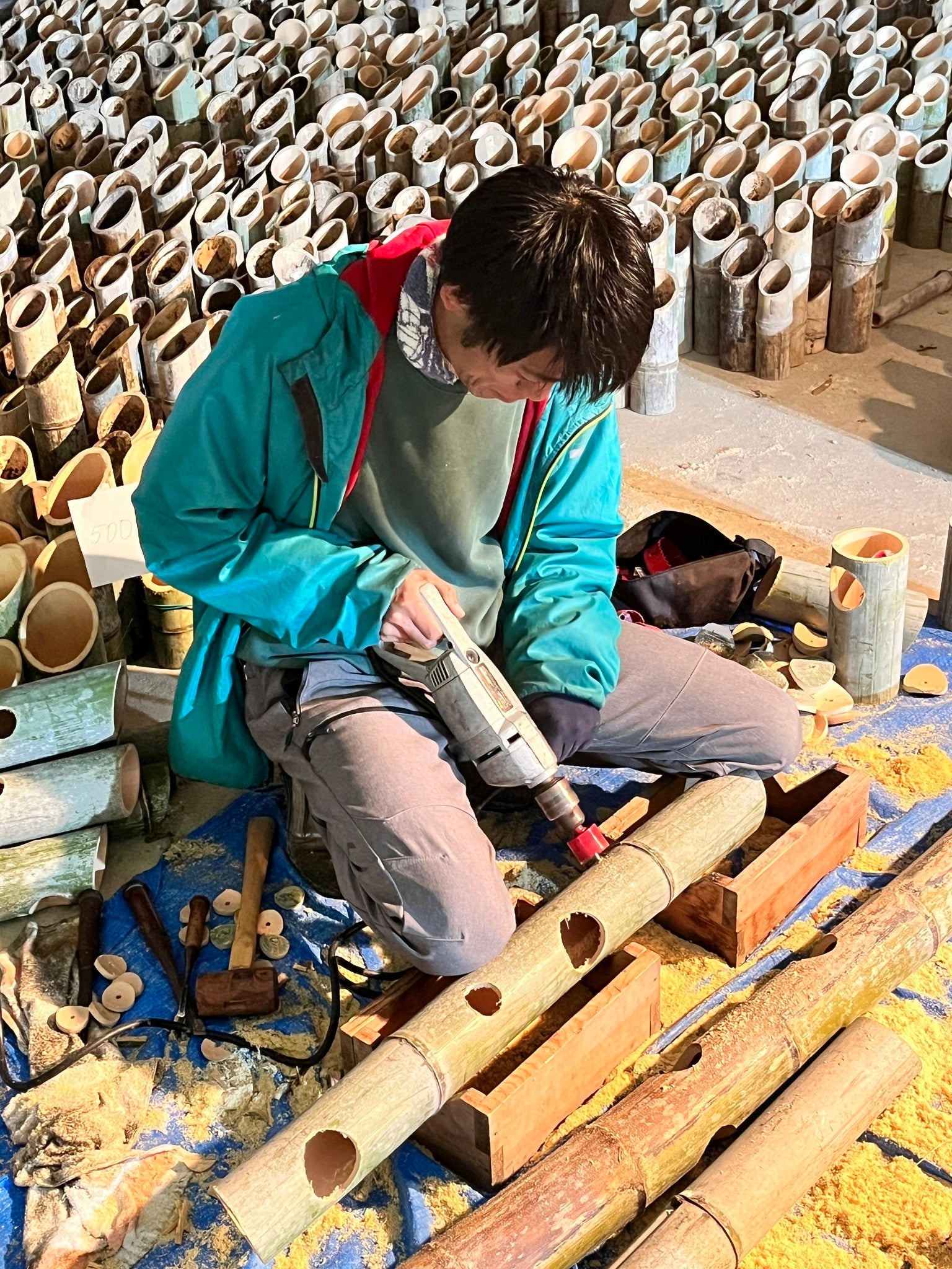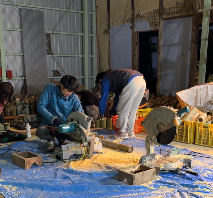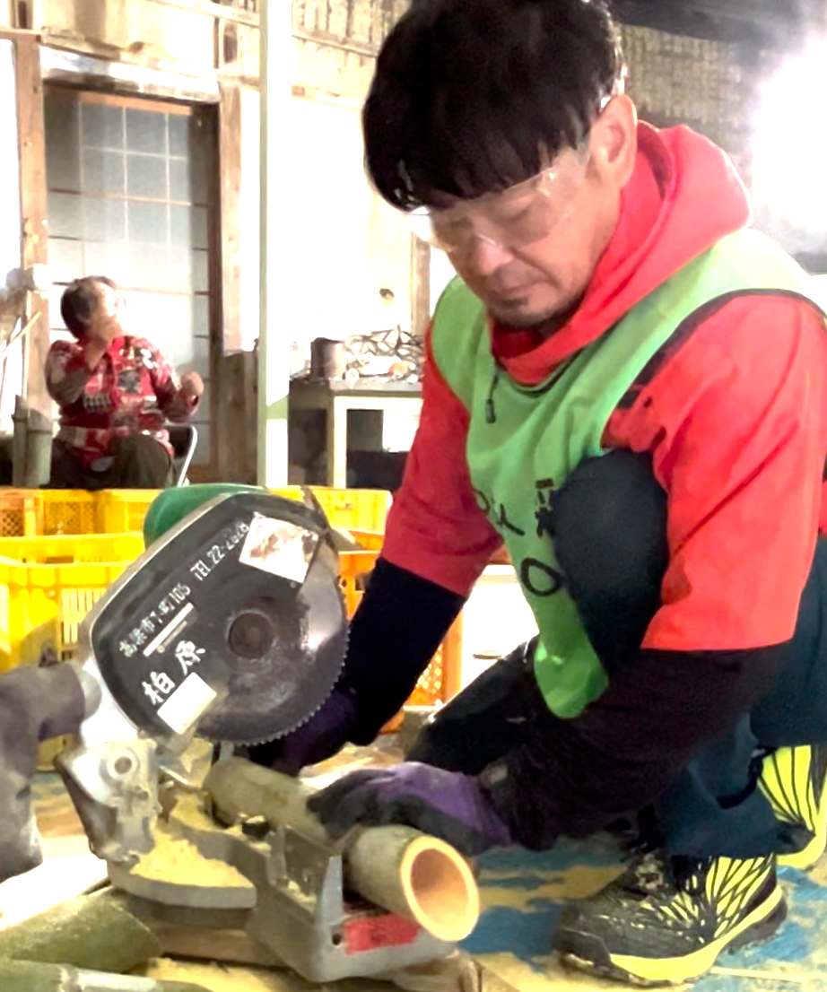 ドリルの音や笑い声が響き合う現場では、立場や世代を超えた多くの人が力を合わせ、竹灯籠づくりを進めています。