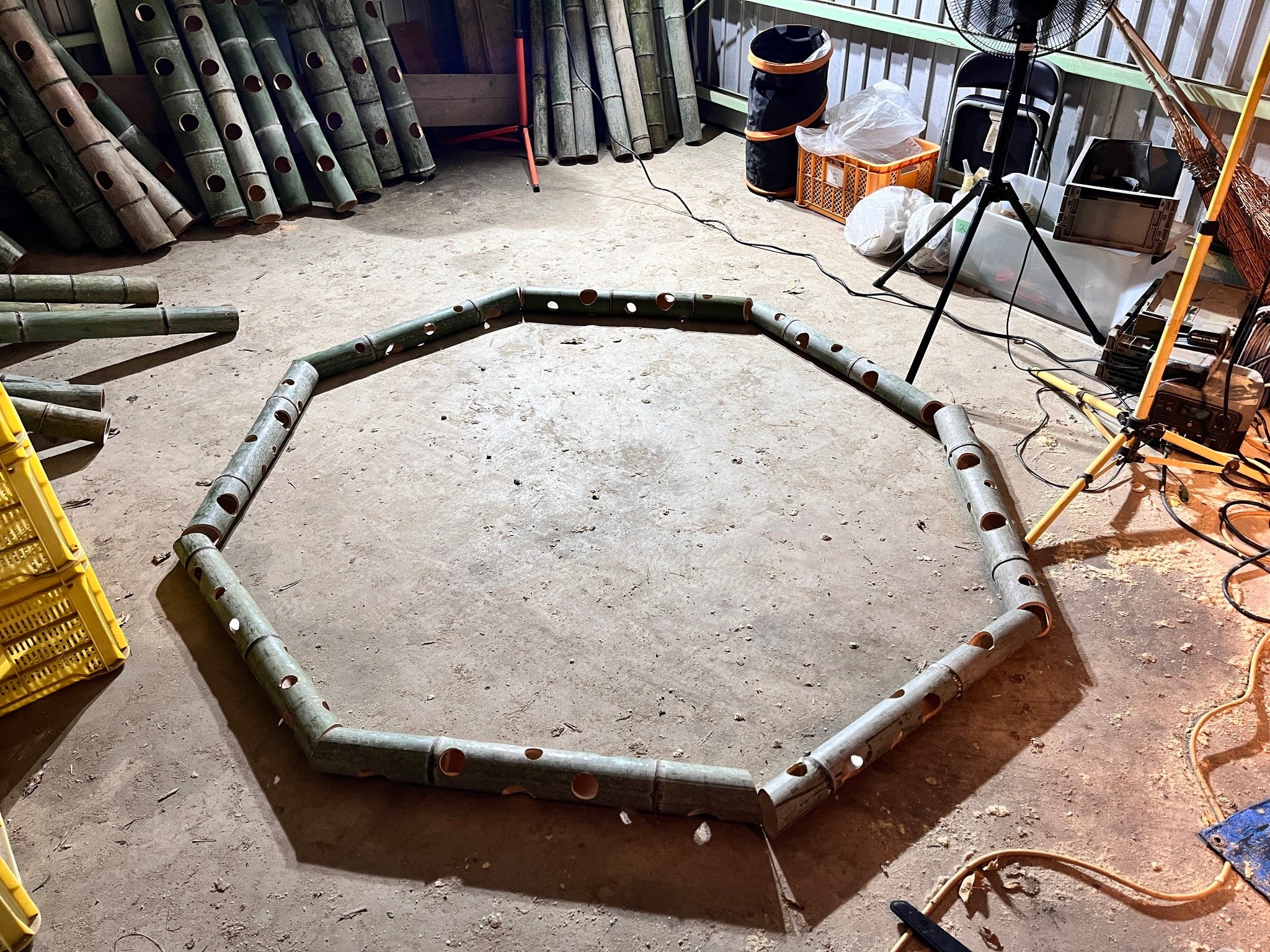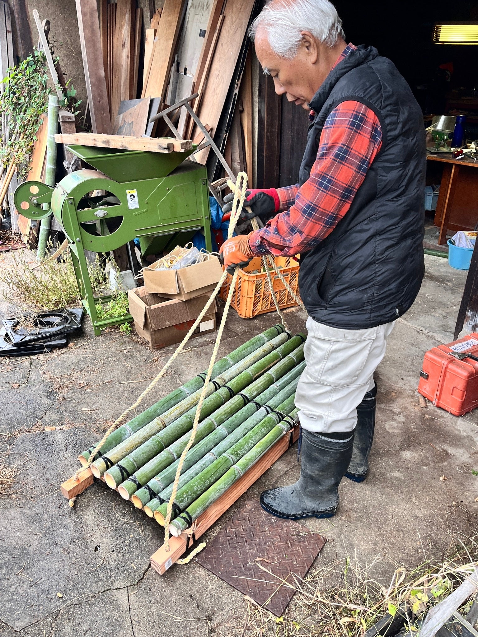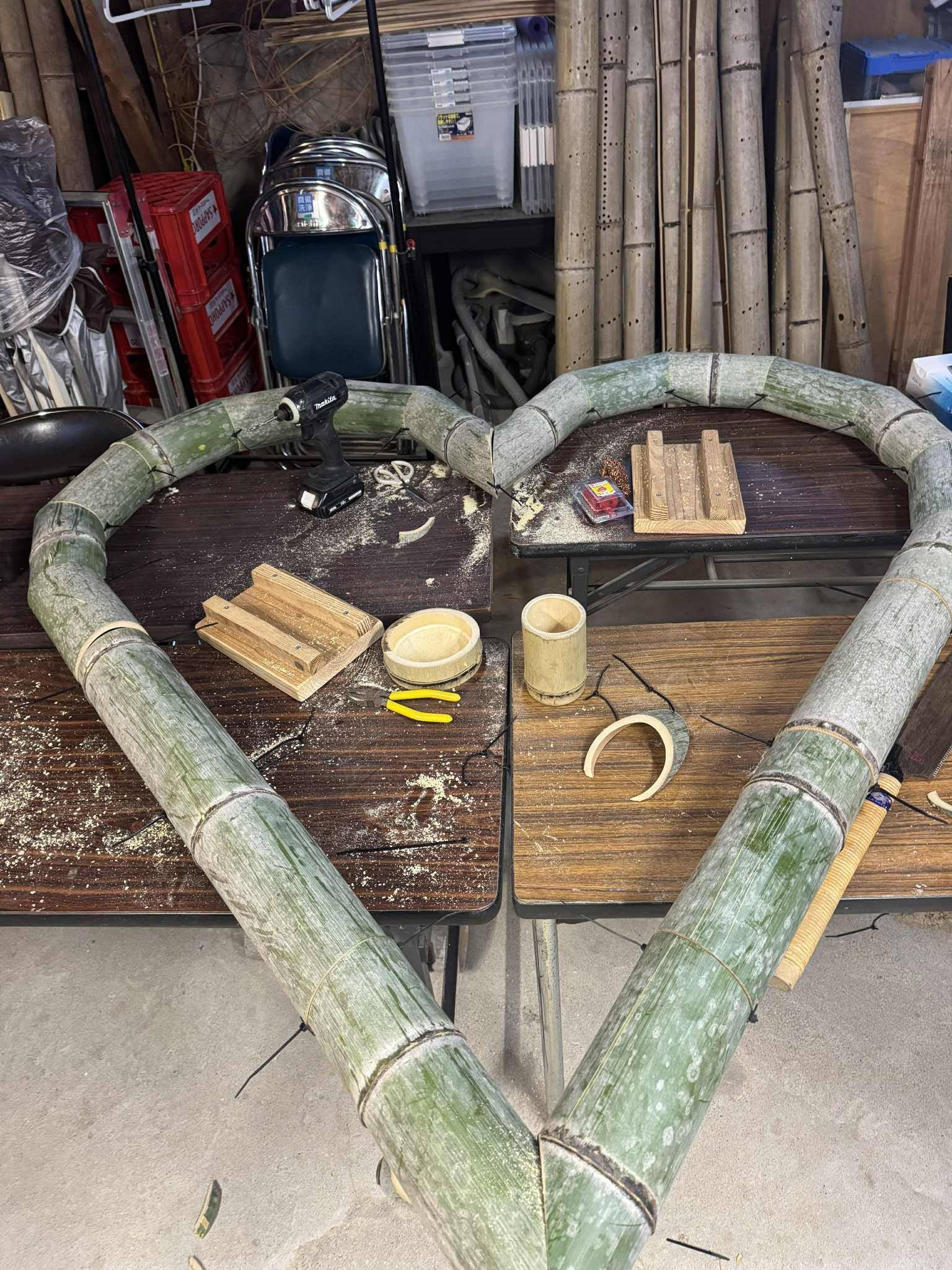 ドリルの音や笑い声が響き合う現場では、立場や世代を超えた多くの人が力を合わせ、竹灯籠づくりを進めています。