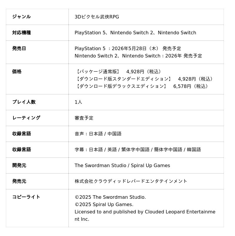 株式会社クラウディッドレパードエンタテインメント(本社:東京都品川区、代表取締役:陳 云云、以下CLE)は、The Swordman Studioが開発する、3Dピクセル武侠RPG『Wandering Sword』につきまして、PlayStation(R)5版を2026年5月28日(木)に、Nintendo Switch(TM) 2版およびNintendo Switch(TM)版を2026年に、全世界向けに発売することをお知らせします。