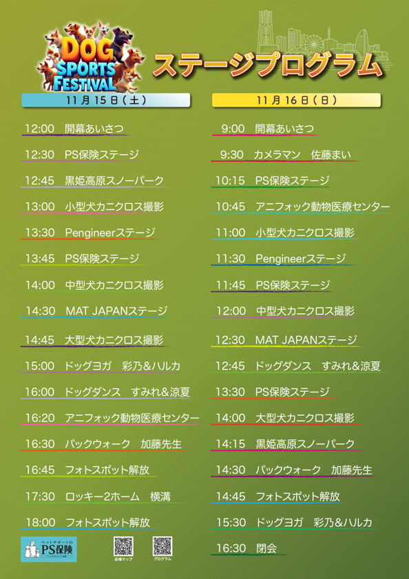 2025年11月15日(土)・16日(日)横浜・臨港パークで開催される「DOG SPORTS FESTIVALFESTIVAL Supported by PS保険(通称:わんスポ)」では、イベントの中心となるメインステージプログラムが決定しました。犬との暮らしをより豊かにするトークショーやセミナー、ドッグダンスやヨガの実演、協賛企業による最新ペットグッズ紹介など、学び・体験・エンターテインメント”が融合した内容でお届けします。さらに会場内にはSNS映え抜群のフォトスポットも登場!