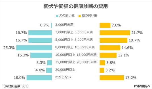・猫:「3,000円以上 5,000円未満」(21.7%)が最多。体格や診断項目の違いが影響か、犬よりも低価格帯が中心。