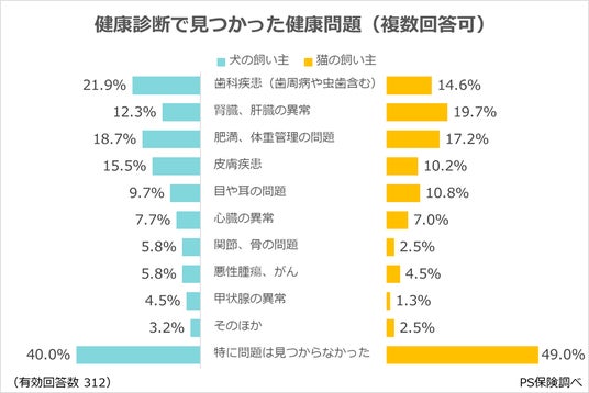 また、「特に問題は見つからなかった」が49.0%という結果から逆算すると、約半数の猫に何らかの異常が見つかっていることになります。個々の疾患の割合は控えめに見えても、健康診断によって多くの猫の健康問題が明らかになっていることがわかります。