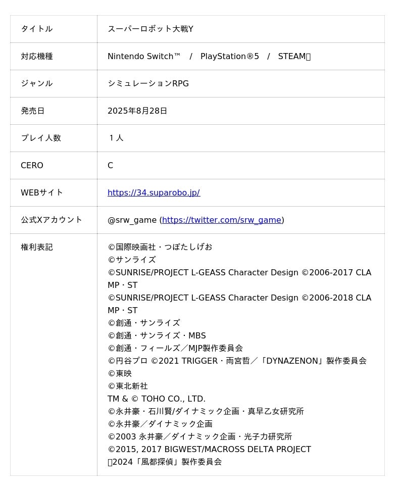 家庭用「スーパーロボット大戦」シリーズ最新作『スーパーロボット大戦Y』のDLC1.の配信日が2025年11月21日(金)に決定いたしました。