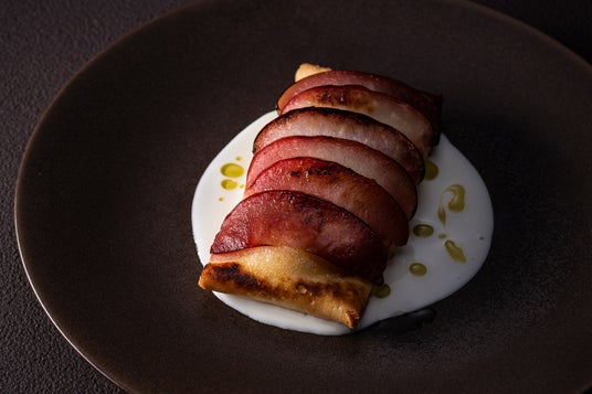 淡路どりとトリュフ風味ポテトのハーモニーをクレープで包み、トップにリンゴのコンポートを貼り付け焼き上げました。仕上げにキャラメリゼした事で、更に複雑なテイストがお楽しみ頂けます。