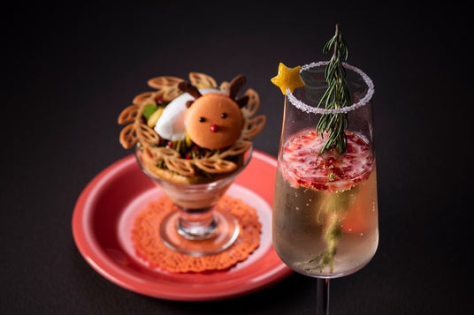 左:キッピス 1,800円(カクテル・モクテル) ライチの爽やかな甘みとイチゴの酸味が調和した、スパークリングカクテル。ローズマリーの香りをアクセントに、サンタクロースの故郷・フィンランドの乾杯の言葉「Kippis(キッピス)」に想いを込めた一杯。