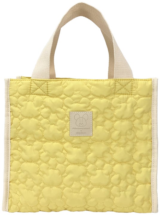 ふんわりとしたキルティング生地を使用したトートバッグです。表面は、「くまのがっこう」のジャッキーをイメージしたキルティングパターンを施したやさしいパステルイエローの生地にコラボ限定タグをあしらいました。持ち手にはしっかりとした綿混素材を使用しているため、快適にご利用いただけます。また、裏地には、絵本『ジャッキーのトマトづくり』をモチーフにしたオリジナルイラストをプリントしました。ジャッキーやトマト、キッチンアイテム、ジョリーパスタを表現したパスタが散りばめられたカラフルなデザインで、開けるたびに楽しい気分にさせてくれます。軽量ながらもマチ付きで収納力があるため、普段使いに活躍すること間違いなしです!