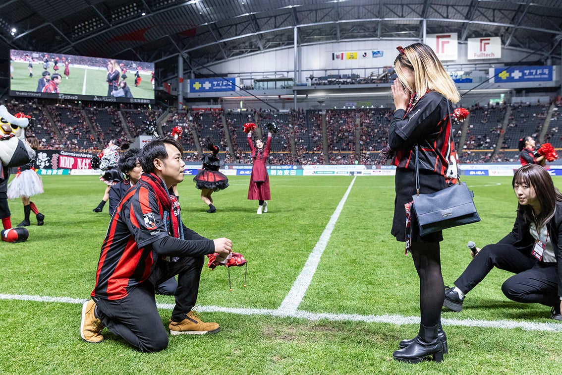 事前応募で選ばれた男性が、ピッチ上でパートナーへサプライズプロポーズを敢行しました。